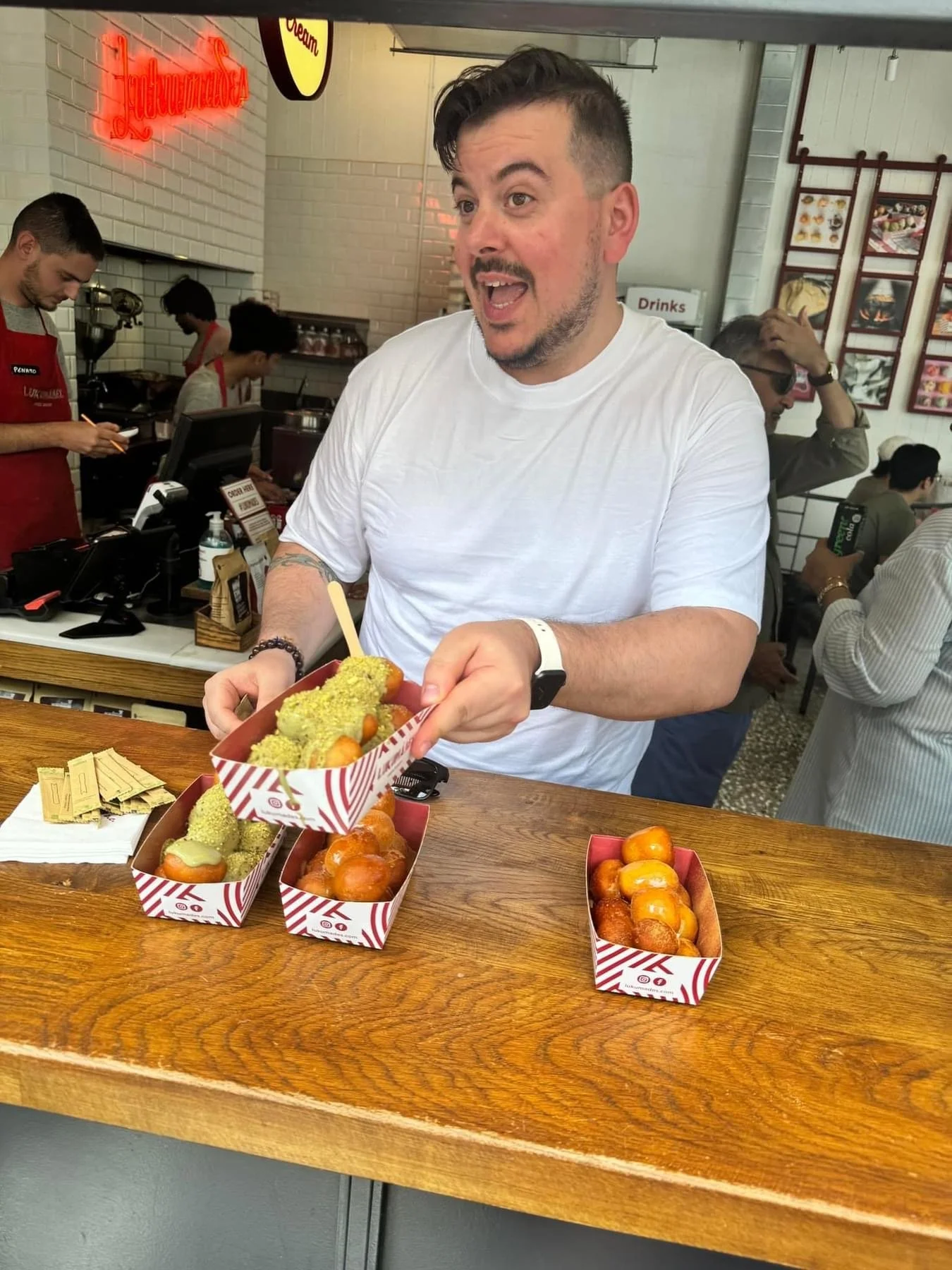 Finally, dessert. Loukoumades are Greek honey donuts—crispy on the outside, soft on the inside, and usually drizzled with honey and walnuts. That’s the traditional way. But me? I go for the version topped with pistachio praline sauce and crushed pistachios. It’s indulgent, modern, and the perfect end to a food lover’s walk through Athens.