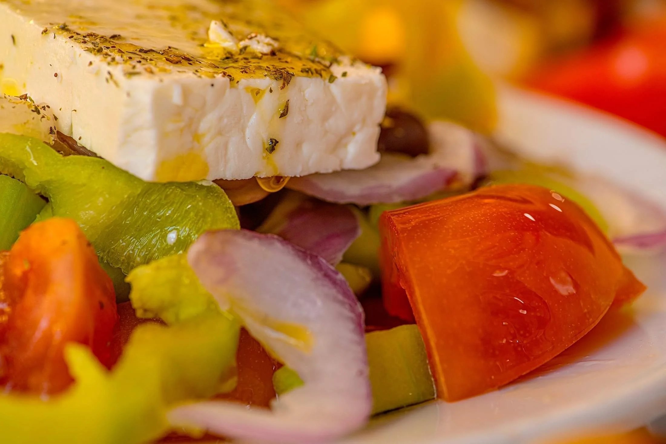 Greek Salad with tomatoes, onions, cucumbers, olives and feta cheese and drizzle of extra virgin olive oil